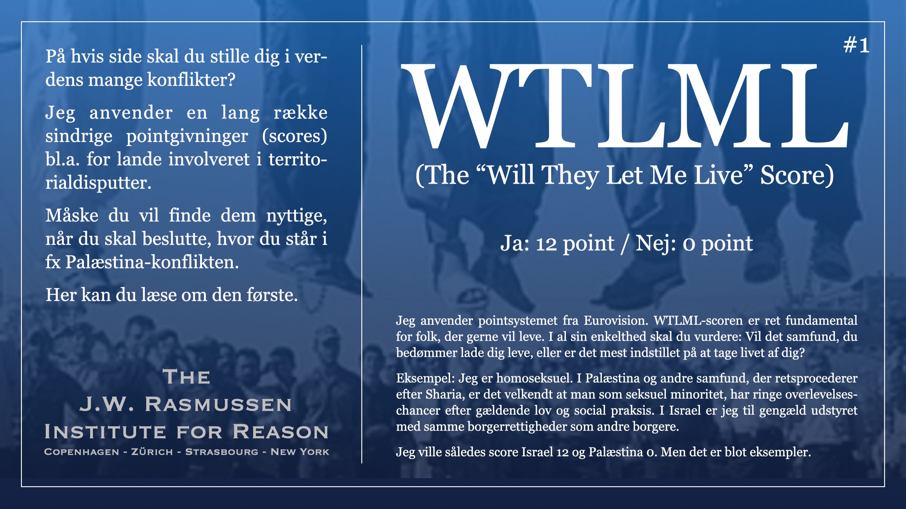 Som Israel-skeptisk eller -hadende dansker bør du spørge dig selv: Hvilket samfund ville du helst selv leve i? Et demokrati med ligeret mellem kønnene, registreret partnerskab for bøsser og lesbiske, ligelig repræsentation i parlamentet af landets arabiske minirotetsbefolkning osv.? Eller en islamisk, sharia-drevet stat, hvor ingen af ovennævnte friheder er gældende?
