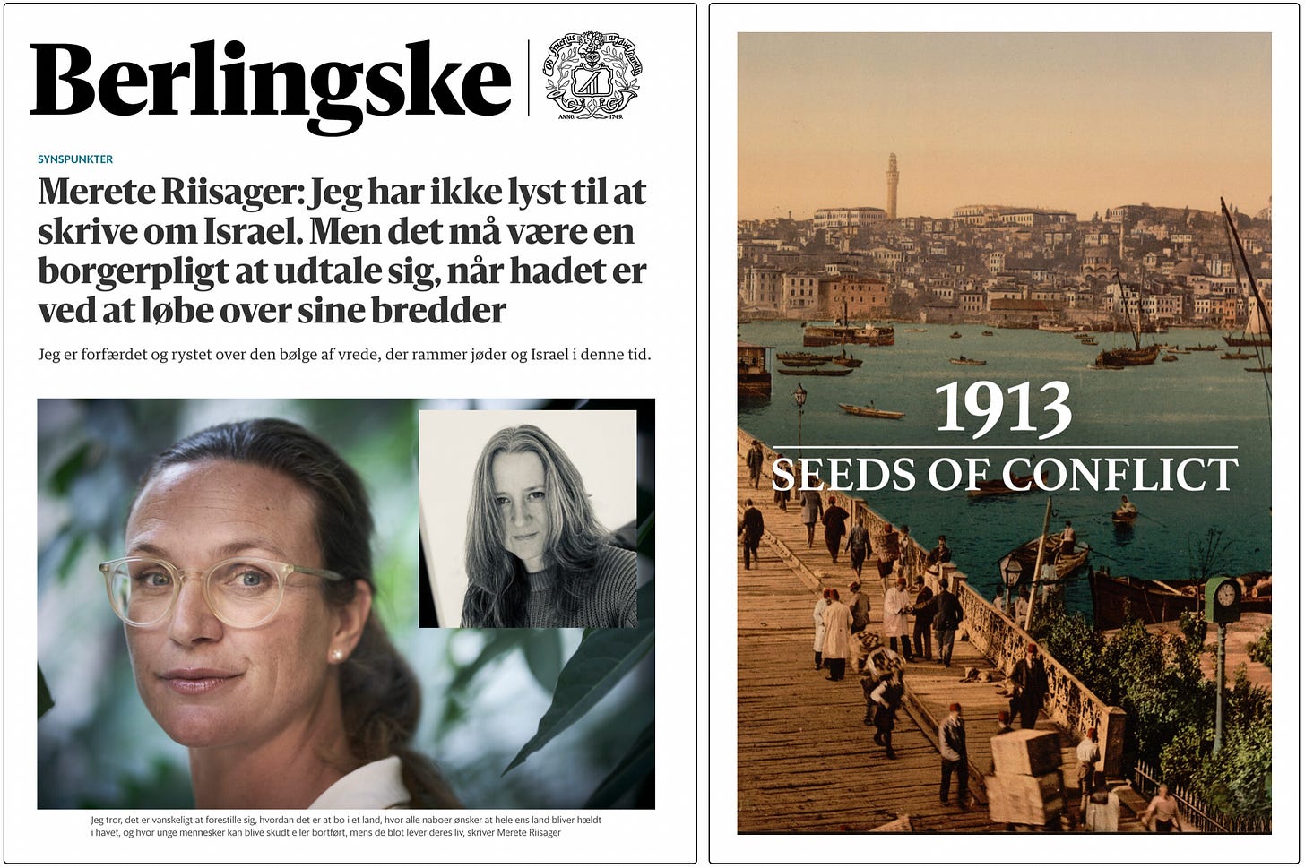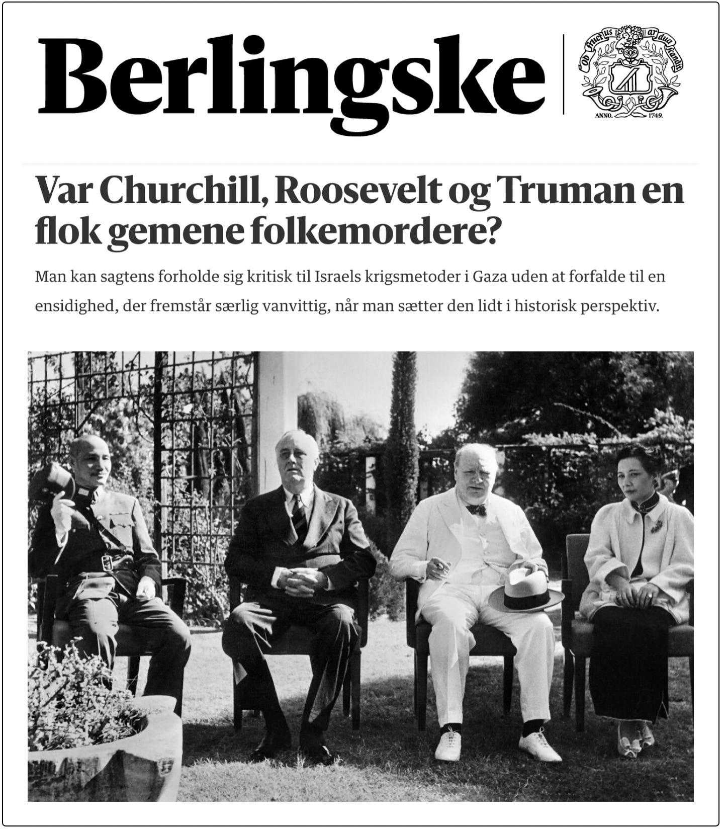 I sin leder fra 8. august 2025 sammenligner Berlingskes chefredaktør Tom Jensen den nuværende debat om Israel med Anden Verdenskrig. Han peger på, at hvis man i 1945 havde fokuseret ensidigt på civile tab i Tyskland og Japan – og ignoreret nazismens og Japans forbrydelser – ville man ende med en fordrejet vurdering af, hvad der var nødvendigt for at vinde krigen. Bombningerne af Dresden, Tokyo og Hiroshima/Nagasaki kostede hundredtusinder af civile liv, men de var afgørende for at afslutte krigen og forhindre endnu større blodbad.