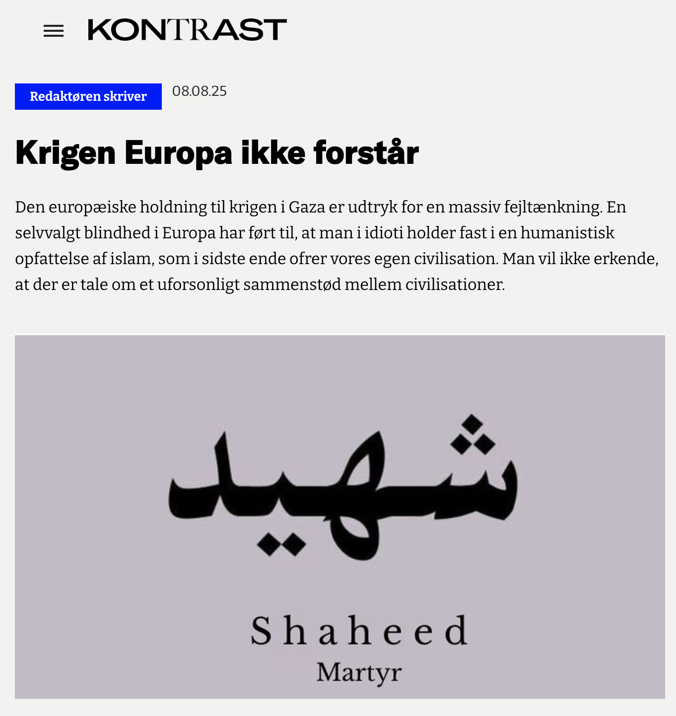 Min nye chefredaktør Lars Kaabers leder “Krigen Europa ikke forstår” i Kontrast er en præcis diagnose af Vestens kroniske fejllæsning af konflikten i Mellemøsten. Han beskriver, hvordan europæiske medier og politikere reducerer Israel til aggressoren og palæstinenserne til entydige ofre, mens man ser bort fra, at Hamas’ angreb 7. oktober udløste krigen.